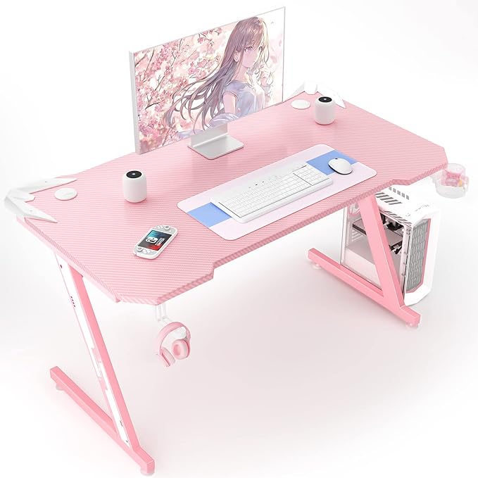 Escritorio de Juego Homall, Escritorio de Computadora con Superficie de Fibra de Carbono, Mesa de Juego en Forma de Z para PC, Estación de Trabajo para Hogar u Oficina con Portavasos y Gancho para Auriculares